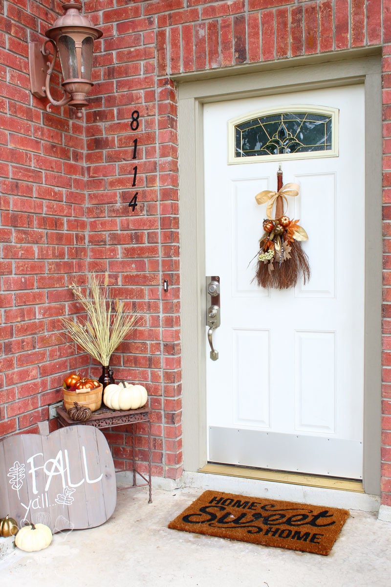 Even though it doesn’t feel like Fall, I still am getting all of my crafting arsenals out to start sharing Fall crafts and decor with you. I’ve already decorated my new dining room chalkboard, now it’s time for the front door.