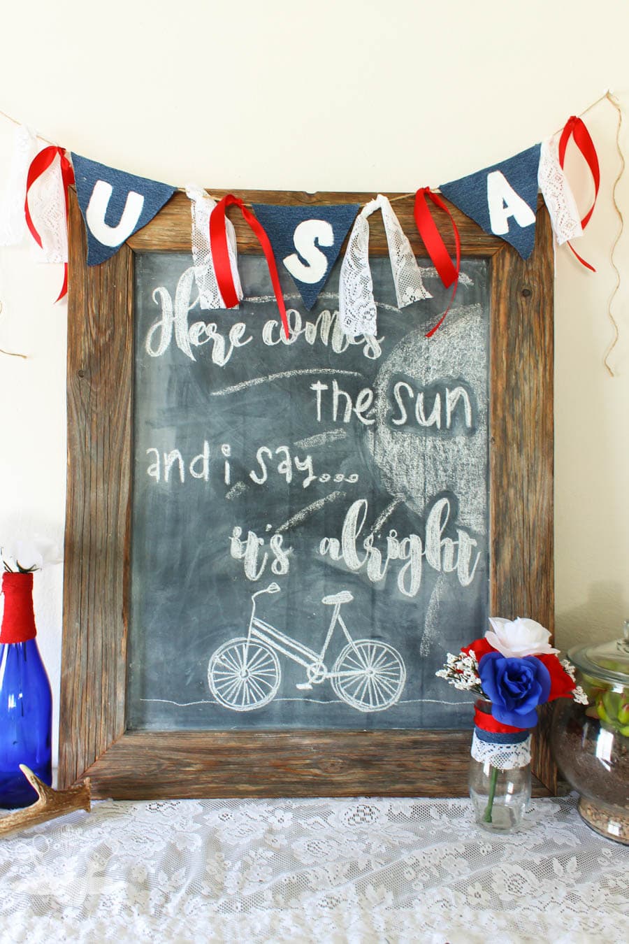 This is so cute, and a great variation of a traditional flag, wreath, or door hanger. I love how you mixed the different textures too. It’s just lovely!